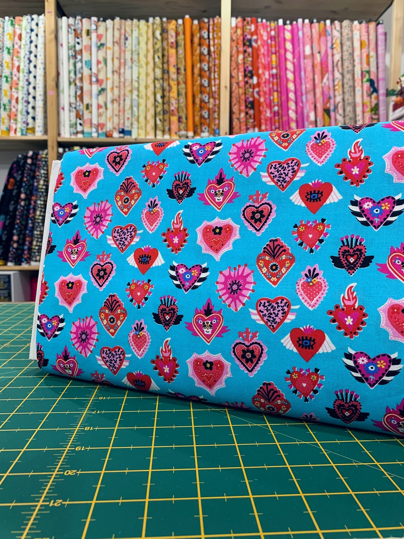 ✂️ Stampa con cuori sacri ex-voto sui toni del rosso e del fucsia su sfondo turchese